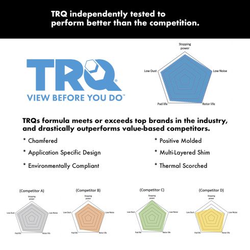 - Trusted Reliable Quality: TRQ brake pads are tested and fitted in their Massachusetts R&D facility, ensuring optimal performance and reliability.