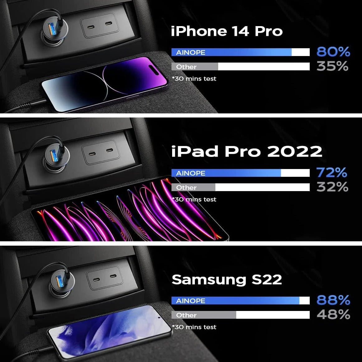 Power your devices efficiently on every drive with this 30W dual-port fast car charger, designed for Tesla Model 3, Model Y, Model S, Model X, and Cybertruck, as well as any vehicle equipped with a standard 12V cigarette lighter socket. Supporting Power Delivery 3.0 (PD 3.0) and Quick Charge 3.0 (QC 3.0), it delivers fast, stable, and safe charging for modern smartphones, tablets, and accessories.