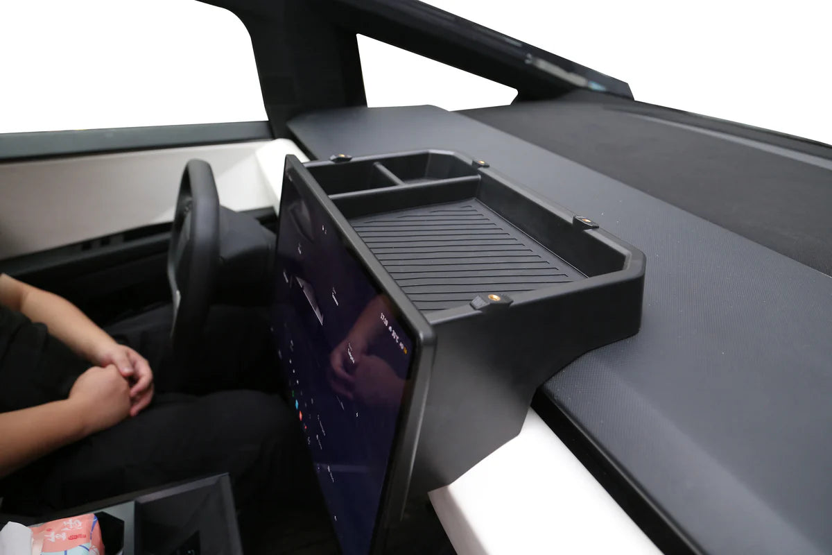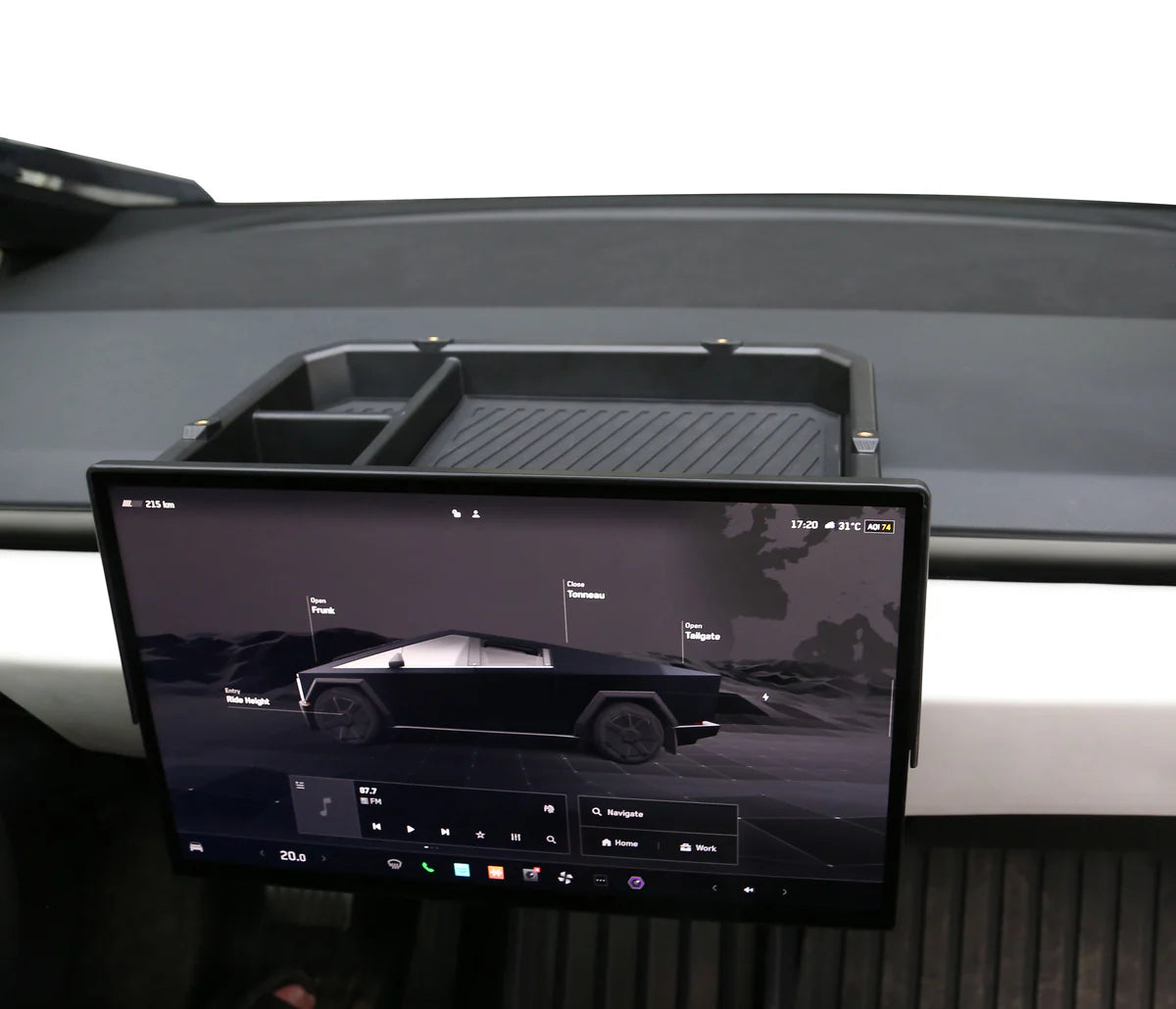 The Dashboard Storage Organizer for Tesla Cybertruck is purpose-built to add practical storage space directly behind the front display, helping you keep small essentials neatly organized without disrupting visibility or vehicle functionality.
