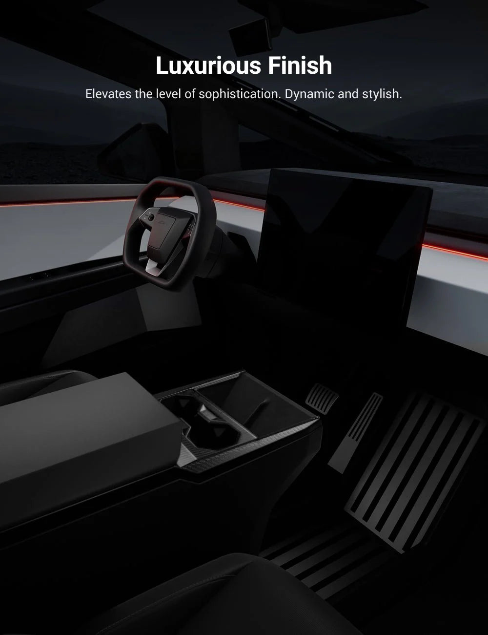 The carbon fiber weave adds a modern, performance-inspired look to the Cybertruck cabin, elevating the overall sense of luxury without overpowering the minimalist interior design.