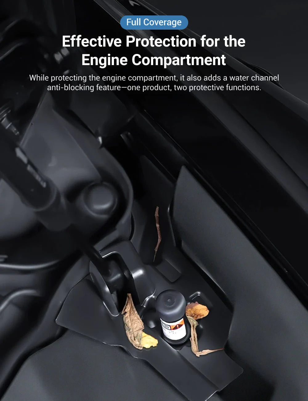 Stops debris from entering the frunk drain channels, preventing water overflow that can damage: