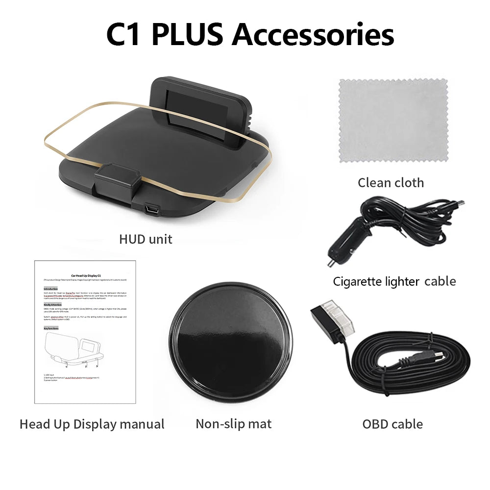 C1 Plus accessories include clean cloth, HUD unit, cigarette lighter cable, head up display manual, non-slip mat, and OBD cable for a comprehensive kit.