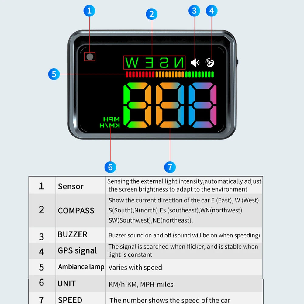 SENSOR FITS ALL CARS FOR SAFE DRIVING. INTRODUCTION TO WA2V HAM HIMM. This device senses external light intensity and automatically adjusts screen brightness to adapt to the environment. It also displays the current direction of the car, including E (East), W (West), S (South), N (North), SE (Southeast), NW (Northwest), SW (Southwest), and NE (Northeast). Additionally, it features a BUZZER that sounds on and off to alert the driver when speeding. The GPS signal light is stable when a connection is established and flickers when searching for a signal. Finally, the ambiance varies with speed.
