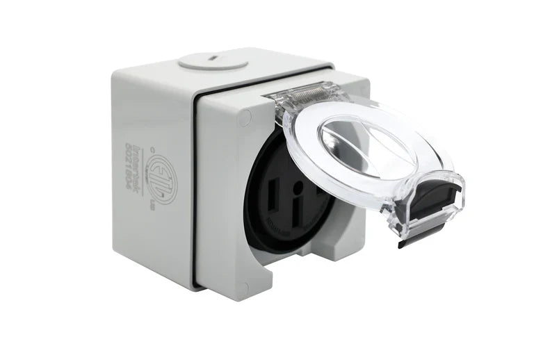 Constructed with rugged, weather-resistant materials, this outlet box offers IP66-rated protection against rain, snow, dust, and debris—perfect for outdoor installations in garages, driveways, parking areas, or campsites.