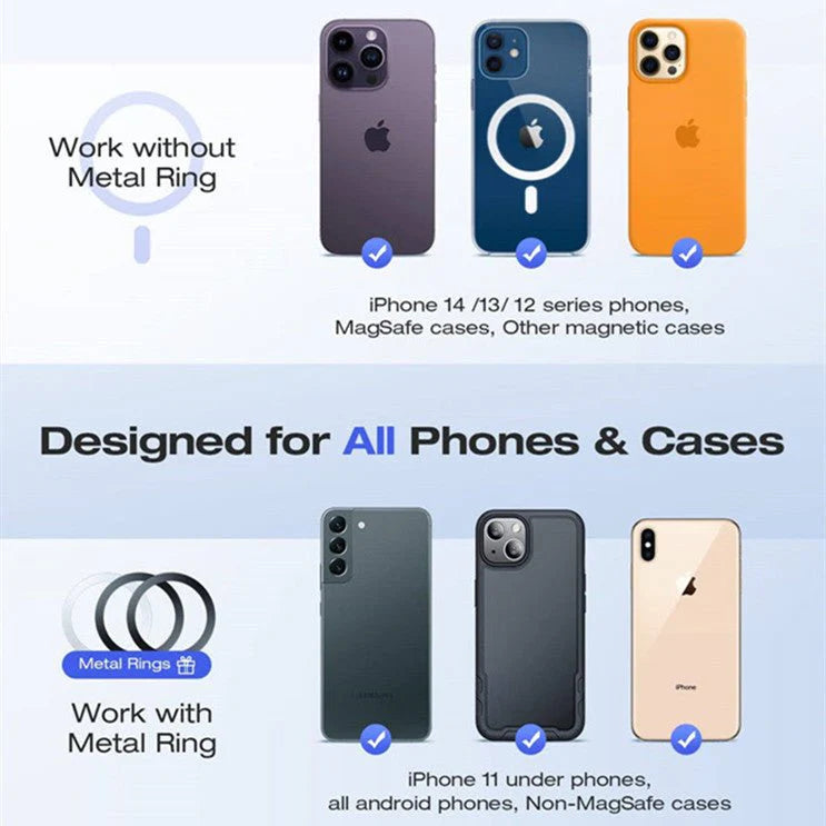 | Supported Phones | iPhone 12–15 Series, MagSafe-enabled phones, Samsung & others with magnetic ring |