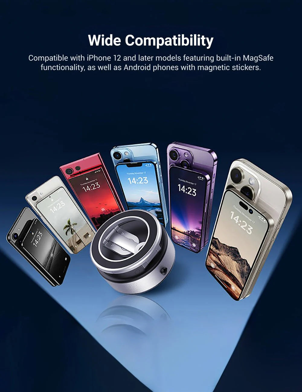 Built with a high-strength magnetic module, the mount automatically locks onto your phone as soon as it gets close. One-hand pickup and placement make daily use simple, fast, and safe while driving.