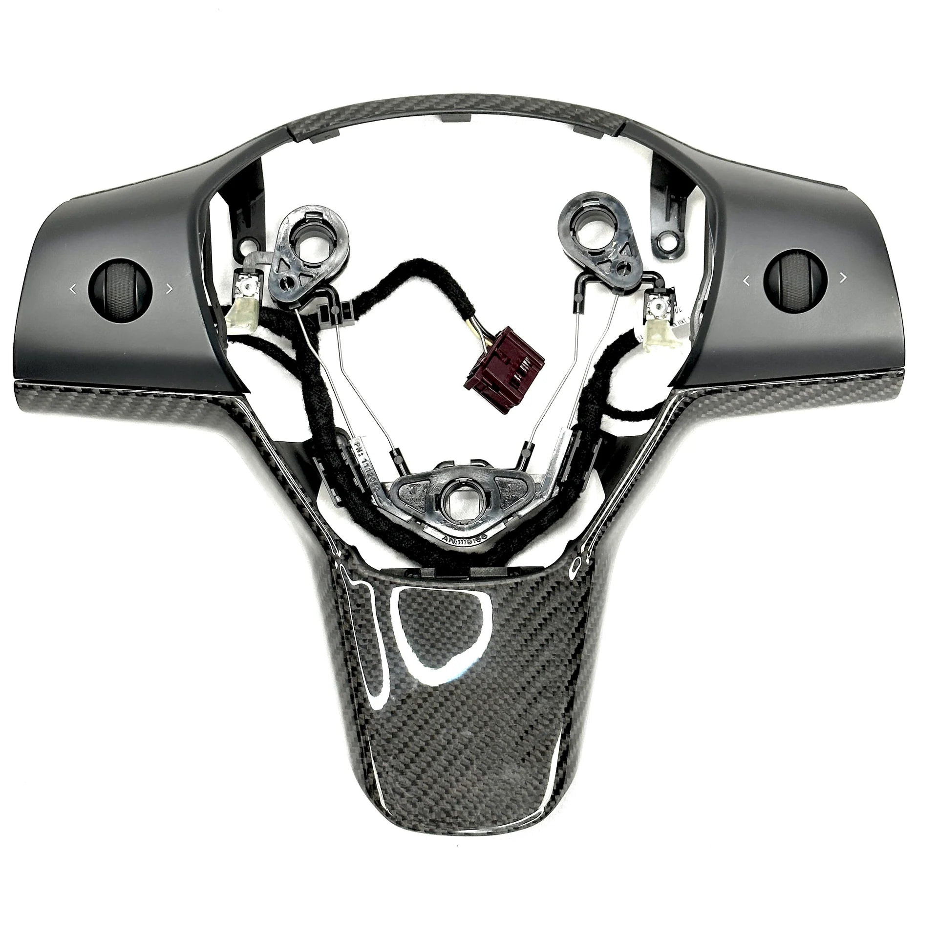 This is not a sticker, overlay, or replica — it is a genuine OEM Tesla steering wheel bezel, professionally wrapped with real molded carbon fiber for a factory-level fit and finish.