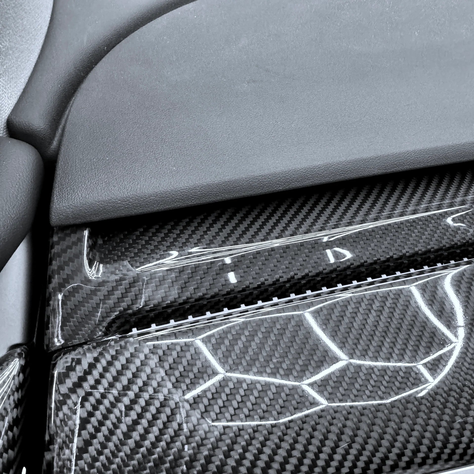 The lower-left to upper-right carbon fiber weave orientation is carefully matched to our carbon fiber dashboard replacement components, creating a cohesive and luxurious interior aesthetic. This is the perfect enhancement for Tesla owners who appreciate authentic carbon fiber details without permanent modifications.