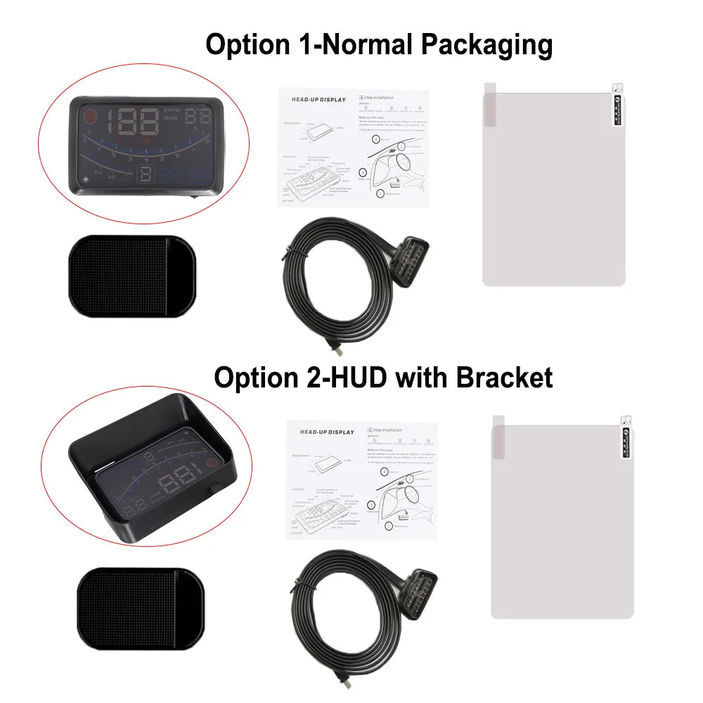 Two options for the Vjoycar HUD product: normal packaging with a head-up display and bracket, or a heads up display with features including 30 degrees of up tilt and a resolution of 2881. Choose your preferred configuration.