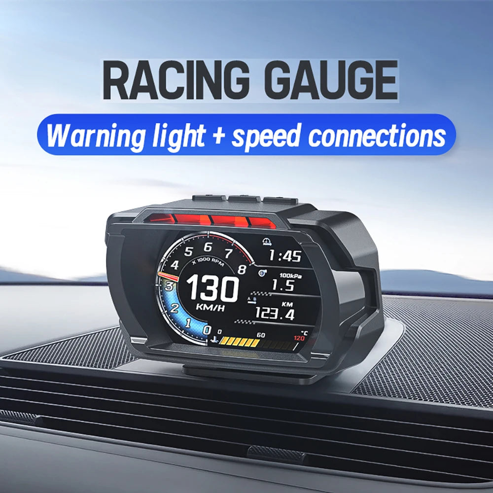 New Design Multi-Functional Racing Gauge. Warning light color changes with speed, featuring 10 themes. Displays car logo and detects more car data. Offers free upgrades. Key specs: 7-inch display, 3-zone layout, 120 mph top speed, 60 mph cruise speed, 4 theme modes.